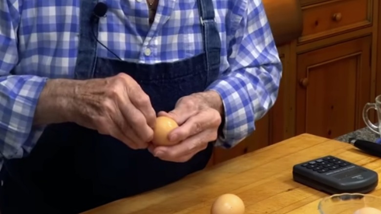 When Ramsay finishes boiling his eggs, he has a specific regimen that he performs. First, he drains the hot water from the pan, leaving the eggs inside. Then, he adds cold tap water over the top of the eggs to start the cooling process. Unlike many cooks, he doesn't use ice water as a step. However, the reason he cools his eggs is one we've previously mentioned: preventing the yolks from turning a color other than yellow. With cold water now occupying the pan with the eggs, he cracks the eggs one by one on the side of the pan and places them back into the cold water in the pan. Then, as the cracked eggs roll around in the cool water, the water starts to make its way into the layer between the egg and the shell — thus, making the egg easier to peel.