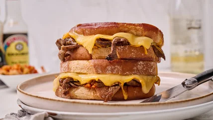 In this bulgogi grilled cheese, shaved steak is marinated in a sweet, spicy, umami-rich sauce and piled onto brioche with tangy kimchi and 2 kinds of cheese.