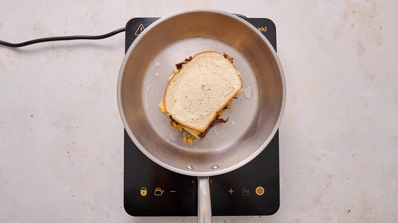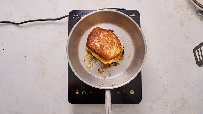 - Add the assembled sandwich and toast until browned, about 2 minutes.