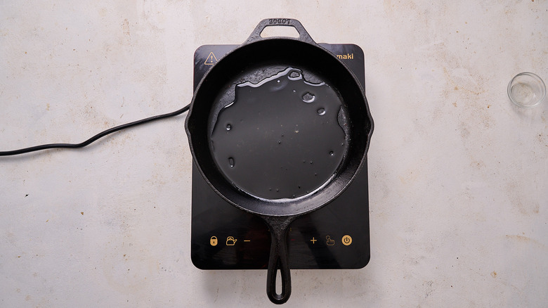 - Heat 2 tablespoons vegetable oil in a cast iron skillet over medium heat.