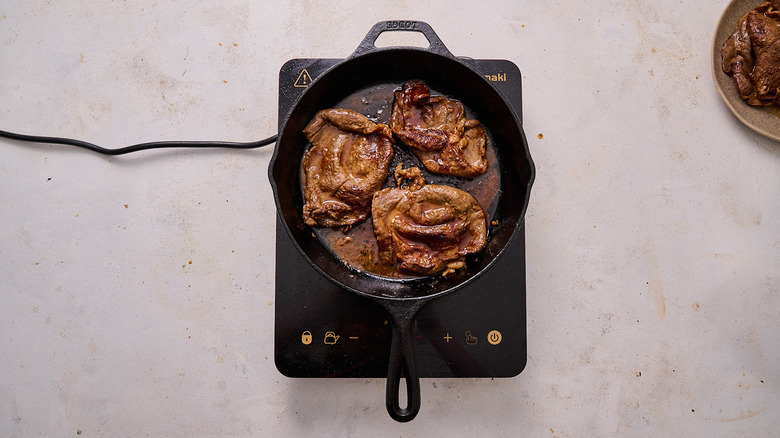 - Add the steak, working in batches if needed, and sear it until deeply browned. Remove it from the skillet and reserve.