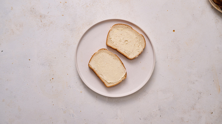 - To build the grilled cheese sandwich, spread butter on one side of each slice of bread.