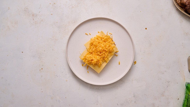 - Add 2 slices of gouda and ½ cup cheddar to the other slice of bread.