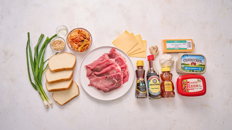 To make the beef bulgogi, you'll first need shaved steak, which is usually ribeye, sirloin, or strip that is sliced paper-thin. To marinate the beef, you'll need soy sauce, honey, brown sugar, sesame oil, garlic, ginger, and gochujang. To cook the steak and build the grilled cheese, you'll need vegetable oil, spreadable butter, thickly sliced white bread, sliced gouda (shredded works too), mild cheddar, kimchi, and scallions.