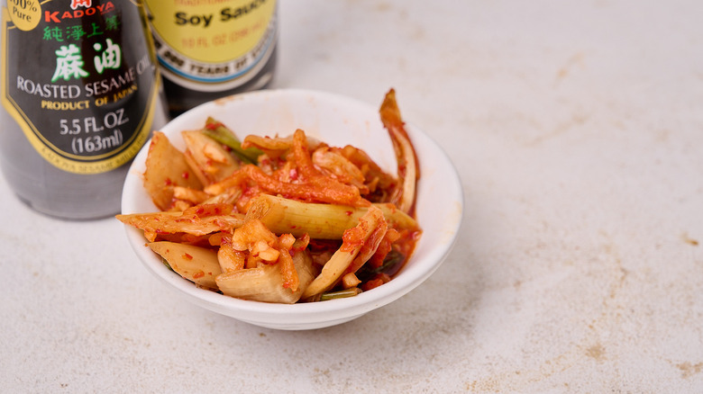 - Add ¼ cup kimchi and a sprinkling of scallions.