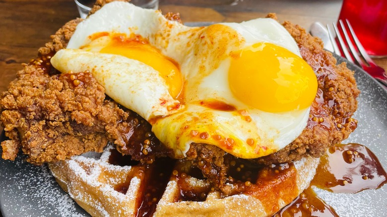 When pressed between those waffles, the soft yolk on the fried egg busts wide open, spilling across the entire sandwich to form a lush blanket of creaminess. In addition to bulking up the sandwich itself, the egg adds richness, a moisture element, and instant creamy texture. With just one runny egg yolk, there's no need to go to a restaurant to find knockout chicken and waffles.