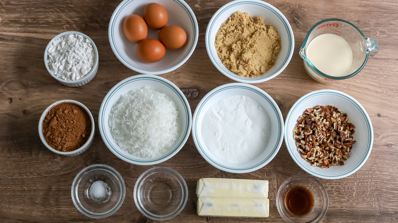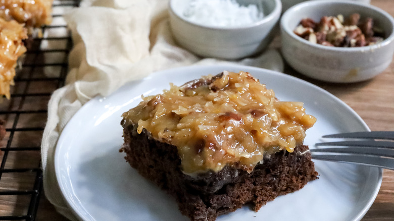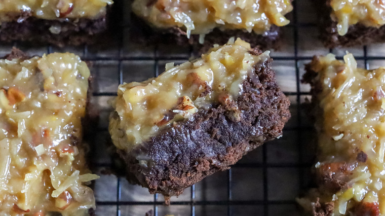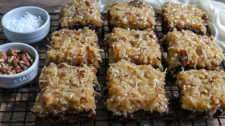 If you're wondering what sets this brownie bars apart and designates them with a German name, Morone shares the scoop. "The part of these brownie bars that makes it 'German chocolate' is the topping, which consists of a caramel-like mixture of egg yolks, evaporated milk, sugar, butter, shredded coconut, and chopped pecans," she explains. For those uninitiated to German desserts, she adds, "This topping is iconic and essential to the flavor profile of German chocolate cake."