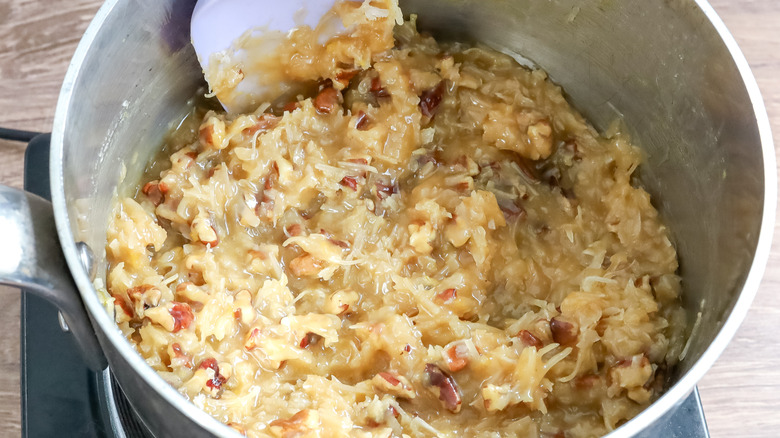 - Remove from the heat and add in the vanilla extract, pecans, and coconut.