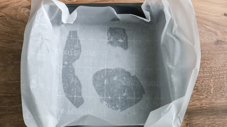 - Line an 8x8-inch square pan with parchment paper or foil, and set aside.