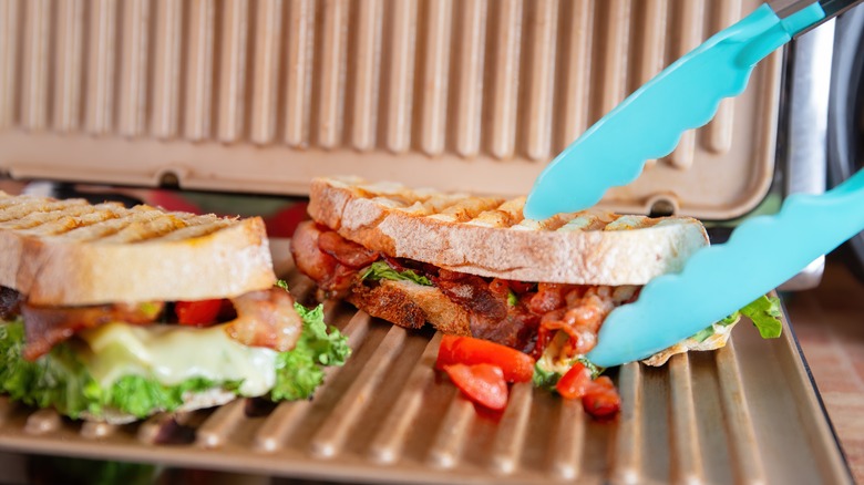 Besides being used to grill up burger patties or make a better grilled cheese, panini pressed can also be used to crisp up any of Starbucks' breakfast sandwiches. Just order a sandwich the next time you're in the store, take it home, and set your panini press to medium heat. Place the sandwich on it and lower the top. While you want the top to be touching your sandwich so you get some nice grill marks, don't press it down too hard. Otherwise, you'll risk your sandwich becoming more of a pancake. Let your sandwich sit on the press for a minute or so and check it periodically. Once there are visible grill marks on the top, turn your sandwich slightly and press down again to create a crosshatch pattern. Leave it on the press for another minute or so until it's golden brown before removing, plating, and enjoying it.