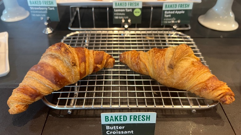 You may have noticed that Starbucks has a variety of fresh-baked pastries for sale. While the chain's bagels and croissants are sold solo, there's no rule against getting one alongside a sandwich and performing a culinary surgery to bring the two together. The secret to getting a breakfast sandwich on a bagel or croissant, rather than the standard bread, at Starbucks is simply to make it yourself.
