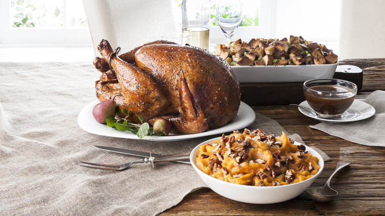 Once your Thanksgiving turkey is safely defrosted, do not wash it. Washing raw meat only spreads bacteria around your kitchen, warns the USDA. You also don't want to stuff the turkey the night before — this practice encourages bacteria growth. The safest way to cook a stuffed turkey is to place it in the oven immediately after stuffing, at a temperature of at least 325 degrees Fahrenheit. Don't cook the turkey overnight at a low temperature, as anything under 325 degrees Fahrenheit is considered unsafe. When the bird is done, its internal temperature should be no less than 165 degrees Fahrenheit. The USDA recommends measuring the internal temperature in three different spots: The thickest part of the breast, the innermost part of the wing, and the innermost part of the thigh.