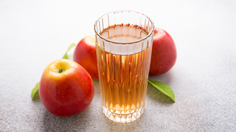 This ingredient is made from fermented apples, sugar, and yeast, which creates a tangy, pungent but subtly sweet apple-flavored liquid. Bringing acidity and mild sweetness with the same tingle you get from alcohol, apple cider vinegar is a top alcohol-free substitute for cooking bourbon. But you'll want to complement it with additional sweetness in your BBQ sauce, or else it's quite potent. Rasheed Philips recommends integrating peach or apricot nectar for a fruity brightness, explaining, "These nectars add sweetness and a mild acidity, which can help balance the richness of the sauce."