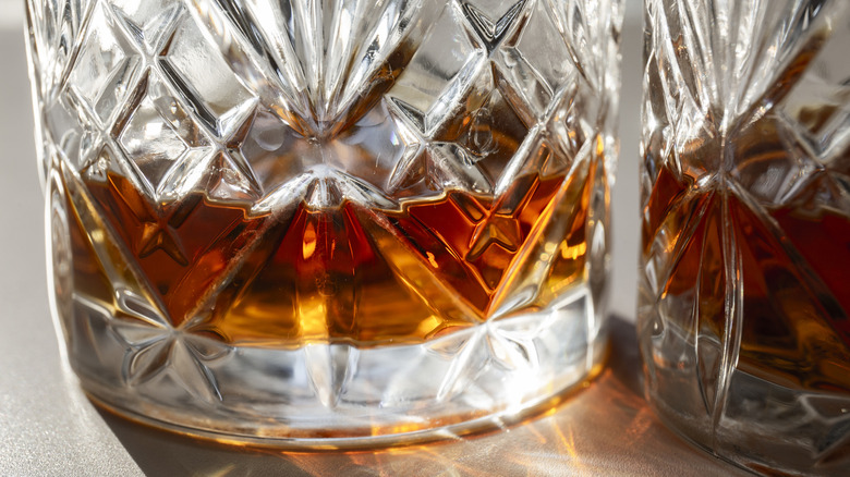 Bourbon is a type of whiskey, so using the latter is one of the closest substitutes to add to BBQ sauce that you'll find. The difference between bourbon and whiskey boils down to the mash bill, which is the types of grain used and how much of each ingredient makes up the drink. While bourbon has to be at least 51% corn with other ingredients like barley and rye, whiskey may vary depending on what kind you're using, such as a rye whiskey being 51% rye. These components can switch up the taste, but generally, you can expect whiskeys to have a warm, sweet taste with a hint of spices.