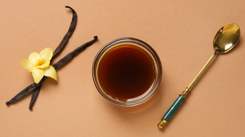 Other top subs like cola or rum have hints of vanilla, so this tip is all about going straight to the source. Vanilla is a popular bourbon replacement in cooking because of its floral, sweet, and creamy notes. But you'll want to use a pure extract, as the artificial flavors won't offer the same taste or similar potency. Although you're using it in small quantities, vanilla extract also has a bite from its alcohol by volume content (which can be as high as 35%) — which marks another bourbon-adjacent aspect.