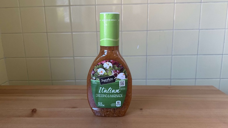 Oftentimes, it makes sense to buy a generic product, which is why you may be attracted to Signature Select's Italian dressing and marinade. But sometimes, it's better to pay more for a higher quality item. That's certainly the case when it comes to this dressing. It's quite sweet; sugar is listed as one of the first ingredients on the label. You can taste that ingredient as soon as you take a bite of your salad — it doesn't seem to integrate very well with the other components. This dressing also has a distinctly artificial flavor that I didn't notice was the case with many of the other brands on this list.