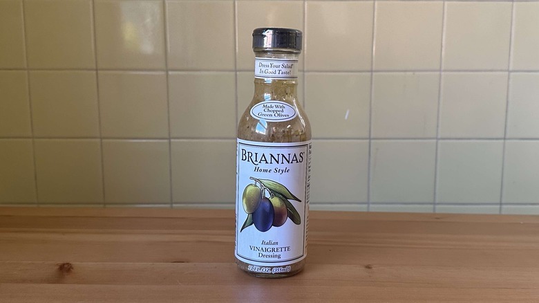 Some salad dressings come with all of the ingredients already very well-integrated with each other; all you have to do is give them a little shake before pouring them onto your salad or whatever you're marinating. But others, like Briannas home style Italian vinaigrette dressing, require you to really put some muscle into shaking things up. Once you do, though, the results are good. The olive flavor is really prominent in this dressing, which makes sense — considering it contains tiny pieces of olives. You can also taste the romano cheese, which gives this dressing a more complex, creamy touch.
