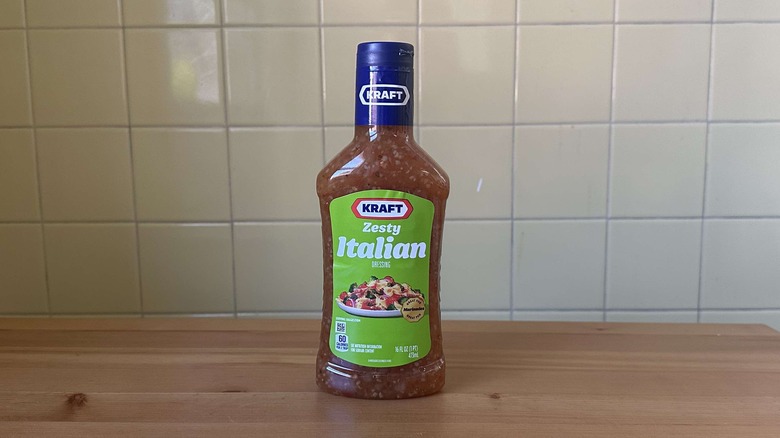Kraft salad dressings are everywhere; there's a good chance you'll find this Italian dressing at your local grocery store or wherever you shop. And if you're looking for a solid, basic dressing, then Kraft's zesty Italian isn't likely to disappoint. When you think of Italian dressing, this is what probably comes to mind: a simple vinaigrette dressing with some acidity, a bit of texture from the oil, and herbs and spices that bring all those flavors together.