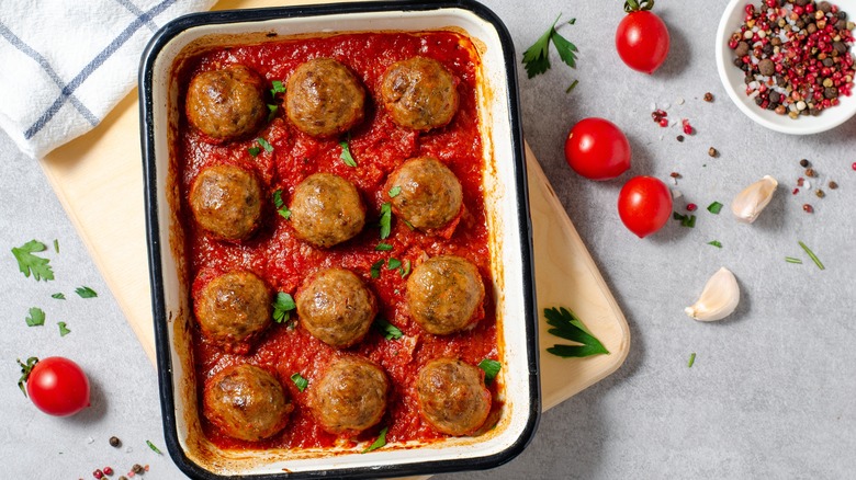 "Making meatballs with Italian sausage is a great way to get a head start on your flavor profile because it's already pre-loaded with that signature Italian seasoning," he told us. There are two main types of Italian sausage to use per Shoults' guidance: sweet or hot, both of which are packed with flavor from spices and can be used interchangeably in meatballs. The main difference between the spices in the sausages is usually red pepper flakes, so go with that option if you like increased levels of heat in your homemade meatballs.