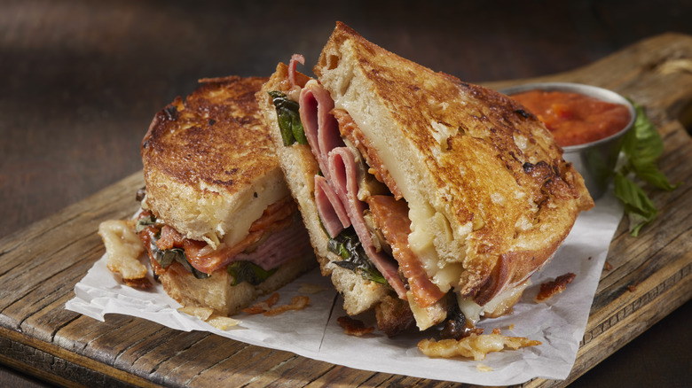 Going for a different approach, you can adapt elements of the Italian sub to your grilled cheese sandwich. This isn't too different from the other way, but unlike Italian subs, which often use ciabatta or hoagie rolls, grilled cheese tends to stick with white bread or sourdough. Since the bread varieties are different, the outcome follows suit. The other original ingredients can remain the same, only joined by a few essentials from the Italian sub. These can be cured meat normally used in the sandwich, such as prosciutto, salami, and pepperoni, and then a couple of basil leaves for a spark of aroma. Maybe even a bit of the Italian sub's vinaigrette. Or perhaps a spoonful of marinara sauce or pesto sauce or a sprinkle of Italian seasoning if you'd like to decorate the sandwich with even more flavors and colors.