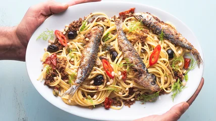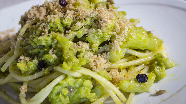 Fresh sardines are common in Sicilian cuisine. But feel free to go with the canned version as a shortcut here, as well as tinned anchovies, as long as they're both packed in olive oil. And while these ingredients are all classic choices for raisin-filled pasta, there are quite a few ways you can switch up your dish. Instead of breadcrumbs, use chopped almonds or even fresh, fried sardines as the topping. Throw in fried capers, garlic, boiled cauliflower, lemon zest, pistachios, or a sprinkling of parmesan. To jazz up the appearance (and acidity) of your pasta, incorporate just a spoonful of tomato paste into your sauteed ingredients.