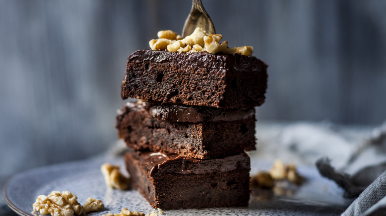 Brownies are susceptible to cracking on the top when sliced because of their very character. They're supposed to be squidgy in the center with a set, crackly-looking crust. It's this combination of a soft-chocolatey middle and an ever-so-slightly firm surface that lends brownies their appetizing mouthfeel and distinctive structure. The problem is that it's this scrumptious quality that makes it so tricky to slice through a batch seamlessly. While using a sharp knife can work, it's time consuming because you have to stop to clean the blade before making each cut to ensure it doesn't catch on the squidgy center.