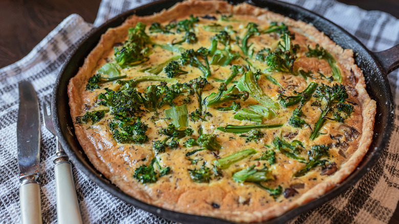 Quiche is one of the easiest breakfasts to make — and it's a little more sophisticated than just making plain scrambled eggs. Besides a kick of protein, you'll also get the crisp texture and buttery flavor of a quality flaky pie crust, which makes quiche an excellent dish to bring to a fancy brunch or to serve as a Sunday special. But instead of reaching for your pie tin for your quiche, consider pulling out your cast iron skillet.