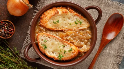 For a soup that's rich and heady like old-fashioned beef stew, pair it with bread made from stout. Not only does the deep brown color mirror the rich stew, but its flavor matches nicely, too. Stout has a slight bitterness to it, with a dark malted taste sweetened by chocolate, coffee, and caramel. Chocolate and beef is an unlikely pairing that brings rich results, with the bitter, earthy notes of dark chocolate balancing out the savory meat.