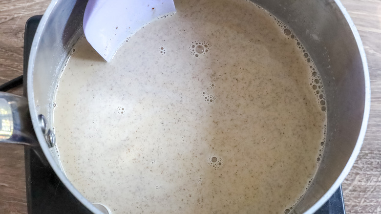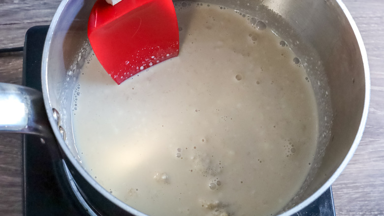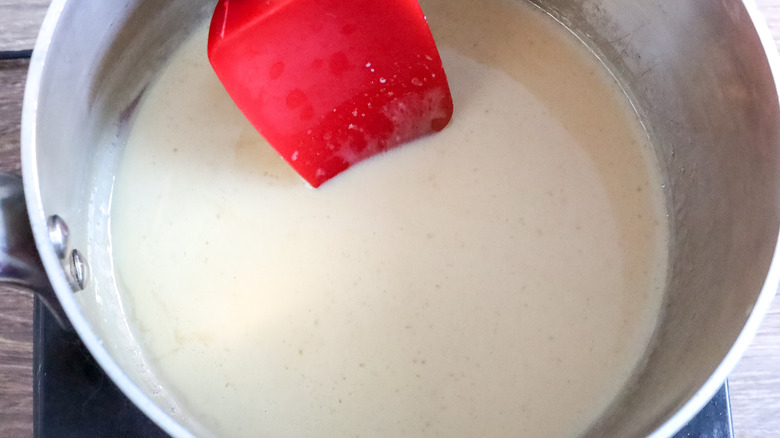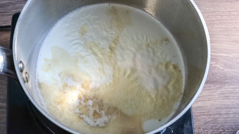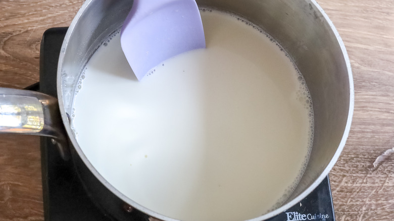 - Add the half and half and sugar to a medium pot over medium-low heat, stirring occasionally until steaming and hot. The sugar should completely dissolve.