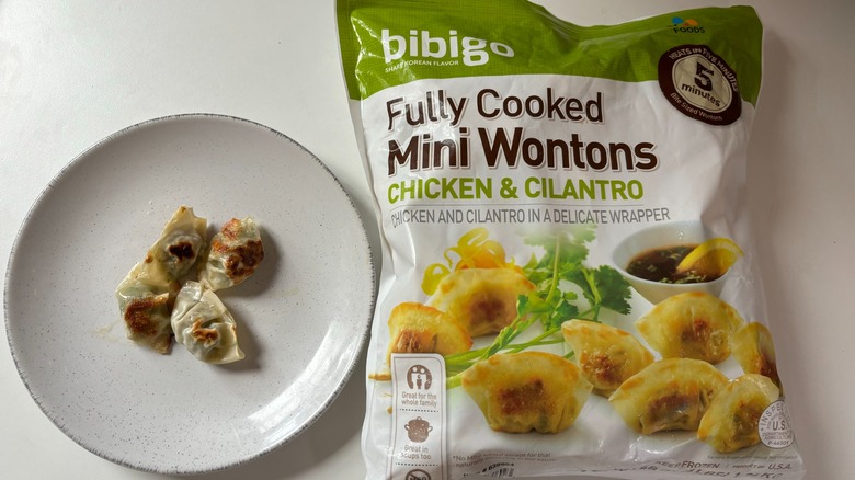When I did a ranking of Trader Joe's frozen Asian-inspired foods, I placed the brand's chicken cilantro mini wontons in second place, so it goes without saying that I had relatively high expectations of bibigo's chicken and cilantro mini wontons. I was careful to prepare these as I did the other mini wontons, by pan-frying and lightly steaming them until cooked inside and a bit crispy outside. This didn't take long at all — about six minutes total — and if I had them in soup, I'd skip the frying altogether and simply boil them with the soup for a few minutes.