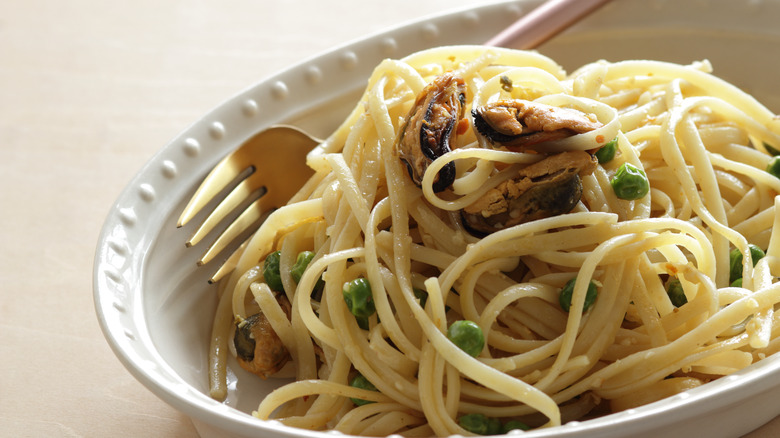 As convenient as canned mussels are, there's another factor to keep in mind when using them in pasta. "Canned mussels can have a slightly saltier and more intense flavor than fresh," Charlotte Langley explained. This is especially true with different varieties. You can find tinned mussels packed in water, olive oil, broth, or a sauce (particularly with the ever-delicious Spanish canned mussels like Vigo's Mussels in Marinade Sauce), and some cans have additional flavorings like lemon, vinegar, or parsley. You can also find smoked mussels, which will (unsurprisingly) have a smoky flavor that takes the seafood taste down a notch.