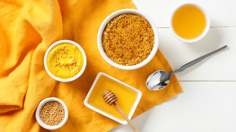 There are lots of creative ways to use honey mustard, but putting it on a baked potato might be among the most unique. The sweetness of the honey and the tangy spiciness of the mustard are a perfect combo to breathe new life into a plain baked spud. With only four ingredients, it's so easy to make your own honey mustard dressing if you don't have any in your fridge. If you are planning to purchase some, however, take a look at our ranking of honey mustard brands before heading to the store.