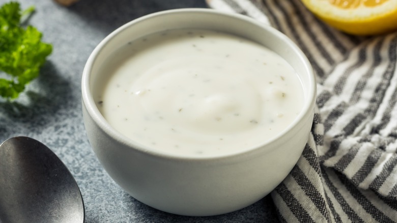 Ranch is the ultimate condiment. From raw vegetables to pizza to spicy chicken wings, it's hard to think of a savory food that ranch doesn't belong on. Ranch dressing is an extremely popular pairing for loaded potato skins, so why wouldn't the same apply to a baked potato? If a dusting of ranch seasoning takes roasted potatoes to a whole new level, imagine what full-on ranch dressing would do to a plain baked potato. Sour cream and chives — two classic toppings for a baked potato — aren't too far off from ranch dressing's main ingredients, so it makes total sense to slather your baked potato in the creamy classic.