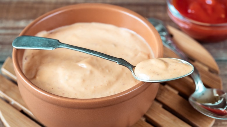 Similar to those secret special sauces served at restaurants, which are stellar on a burger or for dipping fries into, Thousand Island dressing is not only rich and creamy, but also has a bit of texture thanks to the sweet pickle relish commonly found among the ingredients. The pink sauce gets it's slight tang and distinct coloring from the addition of ketchup, which is perfect because French fries and ketchup are a pairing made in heaven, and a baked potato isn't too far off from a French fry. You could also take inspiration from the deli classic Reuben sandwich and top your baked potato with chopped corned beef and coleslaw along with the Thousand Island dressing for a complete and hearty meal.