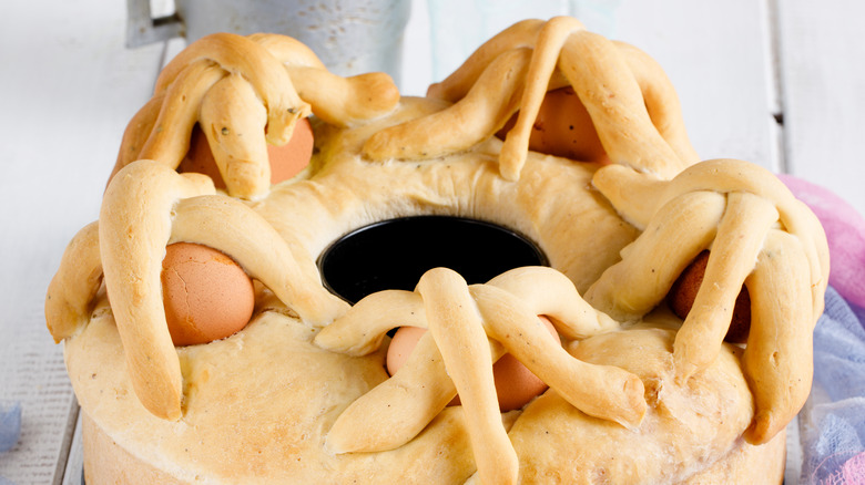 Right around Easter, Neapolitan kitchens are all aflutter with the preparation of casatielli, pastries that are given a shape and aesthetic designed to evoke the death of Christ on the cross and his subsequent resurrection. In particular, after the dough is rolled up and molded into a bundt pan, it is to be topped with whole eggs — shells and all — and covered by two strands of dough, which symbolize the cross. Once the pastry is fully baked, the eggs will be fully encased in it, only slightly popping out, and you'll have to take care not to bite into the shell.