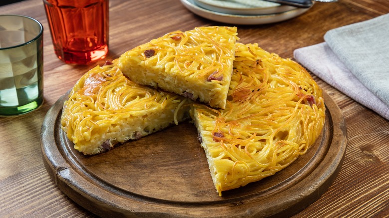 Luckily, the practical and pragmatic people of Naples have a solution for this conundrum, and it relies precisely on spaghetti becoming tough and crunchy. They call it a frittata di spaghetti, and it's a perfect way to use leftover spaghetti without having to feel like you're sacrificing yourself to poor taste by trying to avoid letting those noodles go to waste. And, as with many other Neapolitan dishes, it's simple to make: Just take that leftover pasta, mix it with eggs, cheese, bacon, butter, and milk, and fry it in olive oil until it has achieved a golden crust on both sides. Just make sure that you haven't already added some kind of sauce to that leftover pasta; this recipe will only work if the spaghetti is still plain.