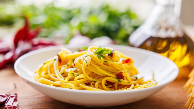 Simplicity is one of the hallmarks of Neapolitan cuisine, and what could be simpler than a pasta dish made with just three ingredients? Indeed, aglio e olio only contains pasta, oil, and garlic (which is the aglio in the equation). But if that doesn't sound flavorful enough to you, think again. When the garlic is fresh, the oil is good quality, and you have the right amount of salt and pepper, you can't go wrong with this dish.