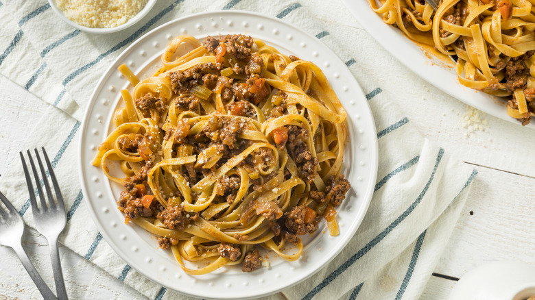 The variation made in Naples is called ragù alla Napoletana and includes chopped beef, sparerib meat, pork sausage, tomato sauce, onions, and red wine. This differs from the classic Bolognese style ragù in the choice of meat and the lack of celery and carrots, mainly. But as with ragù alla Bolognese, it is best paired with tagliatelle or other types of fresh pasta. Just be sure to cook the sauce for a long time, up to four hours, to ensure the meat tenderizes and the flavors blend.