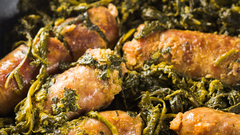 Sausage and friarielli, which are broccoli rabe that grow on the slopes of Vesuvius, was directly inspired by the fruits of the land. As the story goes, a street vendor wanted a side to serve with his pork sausage. He spotted the broccoli rabe growing on the mountainside, which hadn't been consumed much on account of the bitter flavor of the leaves, and decided to partake. This was a good decision, because when fried with some garlic and oil, these greens turned out to be a real treat.