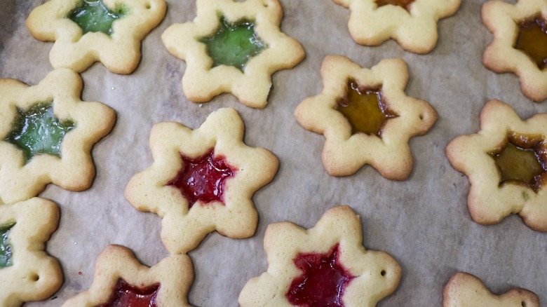 Once you've mastered this paned glass technique, you can go a step further and melt the Jolly Rancher hard candies inside a cookie cutter set on a lined baking tray to create shapes like butterflies, hearts, or flowers to decorate your cake with. The metal boundary circumscribes the candy to the confines of the cookie cutter, preventing the melted corn syrup and sugar that they're made of from spreading out. Having said that, you must ensure you don't overheat the candies or there's a risk they'll leak out from under the cutters or even burn and become bitter. If cake decorating doesn't float your boat, you can also use your boiled sweets to make colorful stained glass cookies or even decorative tree ornaments.