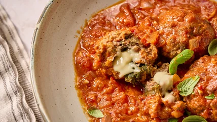 Instead of typical mozzarella, a mild and gooey cheese, recipe developer Michelle McGlinn shares a meatball recipe stuffed with pungent and tangy gorgonzola. Coupled with sauteed spinach, the meatballs have a salty, umami flavor with just a little bit of funk. To balance the rich, savory flavor, the stuffed meatballs are simmered in a classic spicy arrabbiata sauce. The sauce, made with red pepper flakes, tomatoes, and plenty of garlic, showcases the beauty of Italian cooking, using just a few ingredients to make a simple sauce wonderfully flavorful. Serve these meatballs on top of your favorite pasta, as sandwiches in a hoagie roll, or simply on their own for a dinner that is delicious from the inside out.