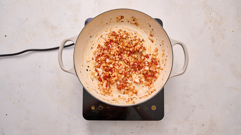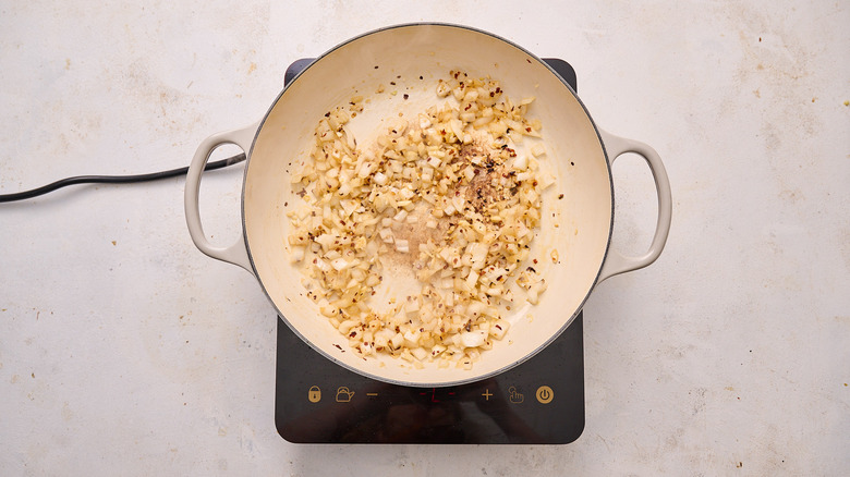 - Add the garlic, onion, and red pepper flakes and saute until softened, about 2 minutes.