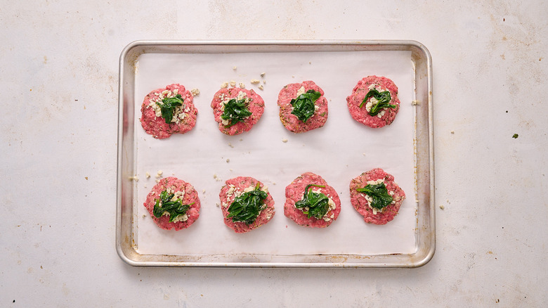 Meatball recipes vary between calling for them to be baked in the oven first for a while or adding them into the skillet right away. In fact, you can bake the meatballs entirely, too, but we think using a little bit of both methods works best. The reason why is twofold: First, baking the meatballs releases the grease onto the sheet tray instead of into the sauce, so the sauce doesn't risk being overly greasy.