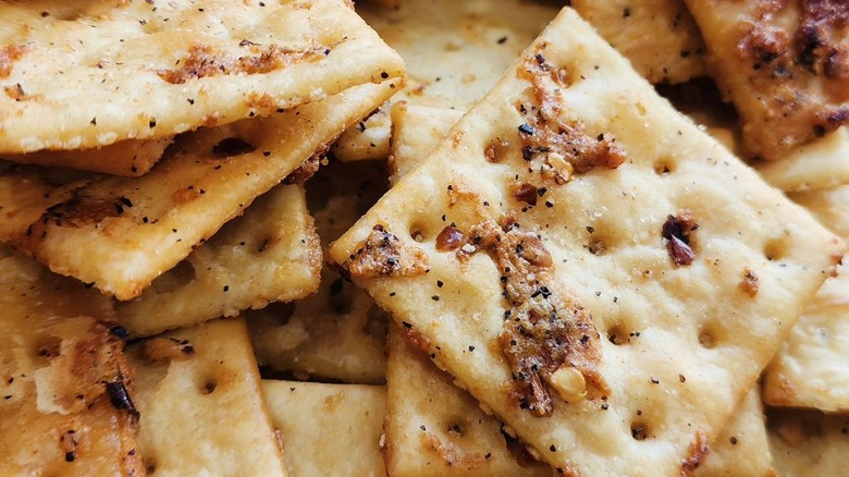Simply dump out the plain crackers into a large bowl and coat in your choice of melted butter or cooking oil. Next, it is up to you to spice and season the saltines to your choosing. It's usual to add some kind of red pepper flakes, sriracha powder, or smoked paprika for a spikier touch, as well as garlic powder and ranch seasoning. Or bring your DIY bagel seasoning into the mix to create more of a savory, herby palate. As the seasoned crackers bake in the oven, they crisp and brown so, aside from just snacking on them, you can also use them to top salads and soups, or crumble some over the surface of your next buffalo chicken lasagna dinner.