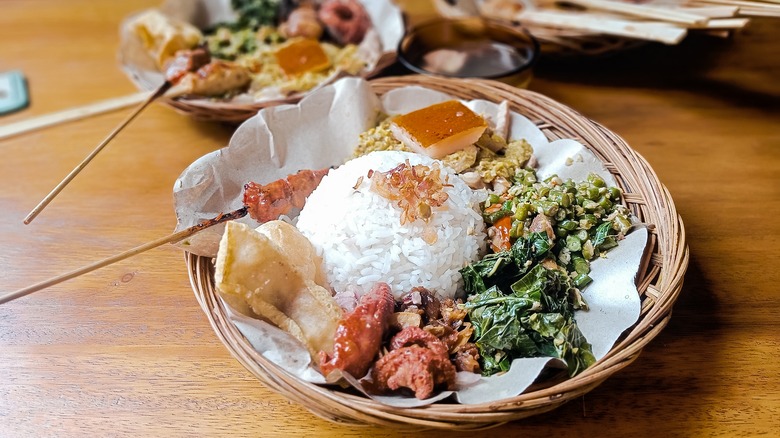Babi guling is typically served with vegetables, rice, and usually other sides made from the whole pig like blood sausage and organ meats. While the many sides served at different restaurants can vary greatly throughout Bali, babi guling is always served with pieces of that impossibly crispy skin, which has been painstakingly separated from the meat once finished cooking. Round out this rich, indulgent meal with a cold, refreshing light beer like Bintang for a true Balinese experience. If you're ever lucky enough to pay the picturesque island a visit, be sure to indulge in as many of the 15 best foods and drinks to try in Bali as possible.