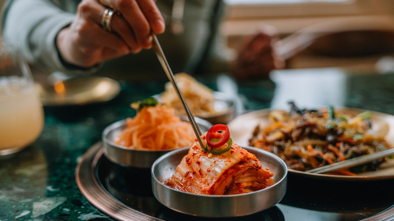 Even if you don't pick an all-you-can-eat Korean barbecue spot, your banchan, or Korean small plates, are often replenishable. Bachan — including kimchi, wilted bean sprouts, and cucumber — are intended to be munched on immediately; servers usually drop the small dishes shortly after a table decides on their meat order. But, you should avoid eating them as soon as they arrive, as they're meant to act as a crunchy intermission between the bits of salty meat — like a pickle plate. Plus, you can also include bits of banchan into your ssam for texture.