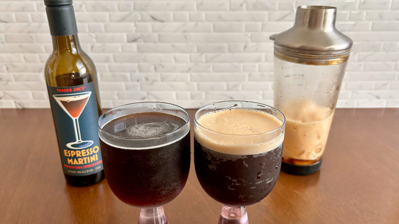 I initially thought Trader Joe's espresso martini was pretty good and perhaps even comparable to a homemade one ... until I actually tasted a freshly made espresso martini. Drinking the two back-to-back really put into perspective just how good a homemade espresso martini is, and perhaps more importantly, just how lackluster the Trader Joe's one was. For starters, the homemade one just simply looked so much better than the TJ's one — for context, the TJ's espresso martini is on the left in the picture above, and the homemade one, with a foamy head, is on the right.