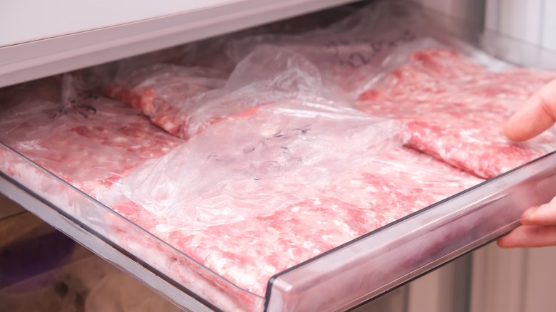 Want to perfectly portion quantities of ground beef? Whether it's wrapped in flimsy packaging or well-sealed chubs, you might not want to be burdened with having to defrost an entire portion of mince at once. In this case, remove the protein from its original packaging and place it into plastic bags. After using a rolling pin to remove excess air, the bags can be sealed, labeled, and frozen for later. Speaking of which ...