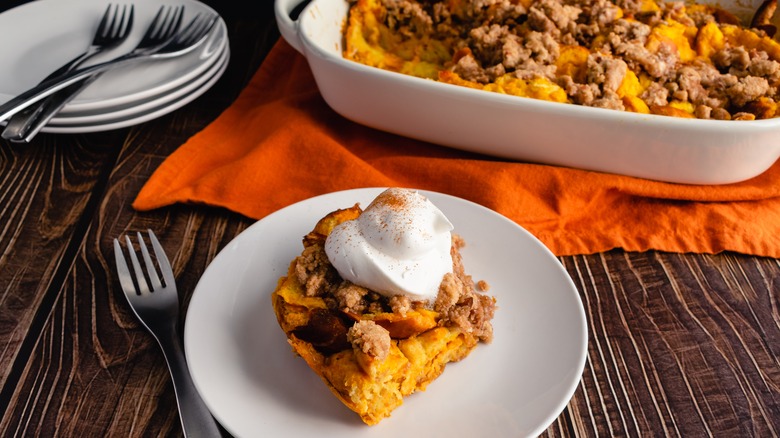 If you're making French toast for a crowd, cube slices of Trader Joe's pumpkin brioche twist and add it to eggnog French toast casserole to get your guests into the holiday spirit. Choose the right glass casserole dish that has the depth and durability for your many fall breakfast casseroles to come. Serve your fall inspired breakfast with Trader Joe's pumpkin spice coffee or pumpkin spice-flavored cold brew.