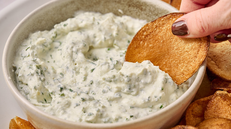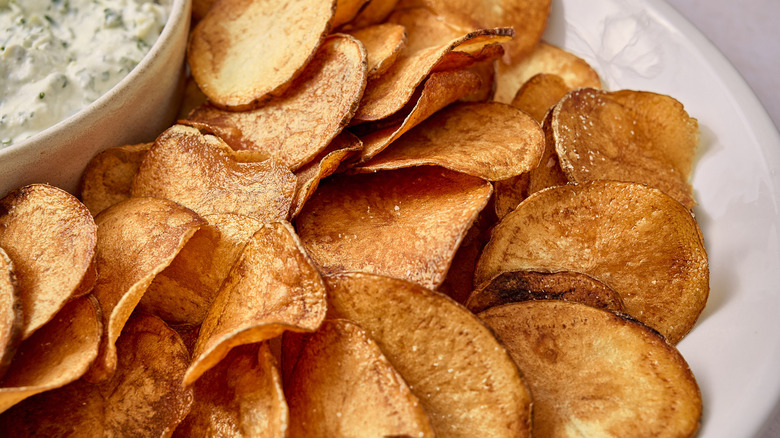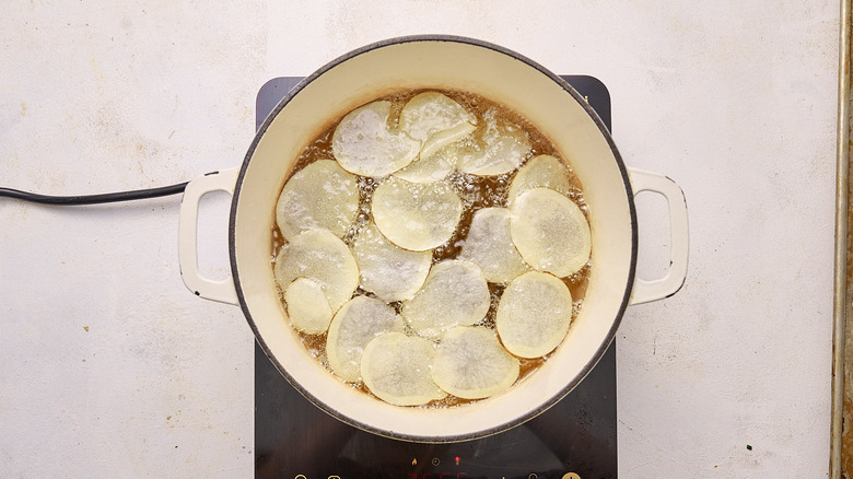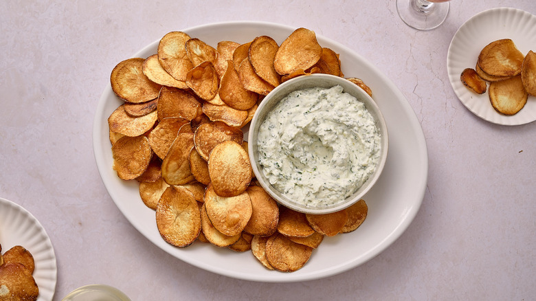 When was the last party you attended that didn't have some form of chip and dip? Both inexpensive and effortless, the easy party snack is a host's dream; a light bite that can be brought together in seconds. It's a humble snack, one that doesn't serve to impress — unless, of course, you make it from scratch. Frying your own chips turns what is usually an overlooked appetizer into the star of the show, and coupled with a homemade onion dip, it becomes a memorable offering. Making chips from scratch isn't hard, either: You just need a Dutch oven, potatoes, and some oil.